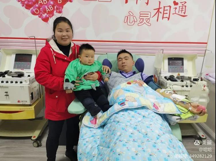 丈夫鲍甜甜正在捐献机采血小板,妻子何叶带着幼子全程陪伴,为其加油点赞,呈现出温馨感人的画面。鲍甜甜无偿捐献全血4300毫升,无偿捐献血小板4个治疗量,已累计献血总量5100毫升。